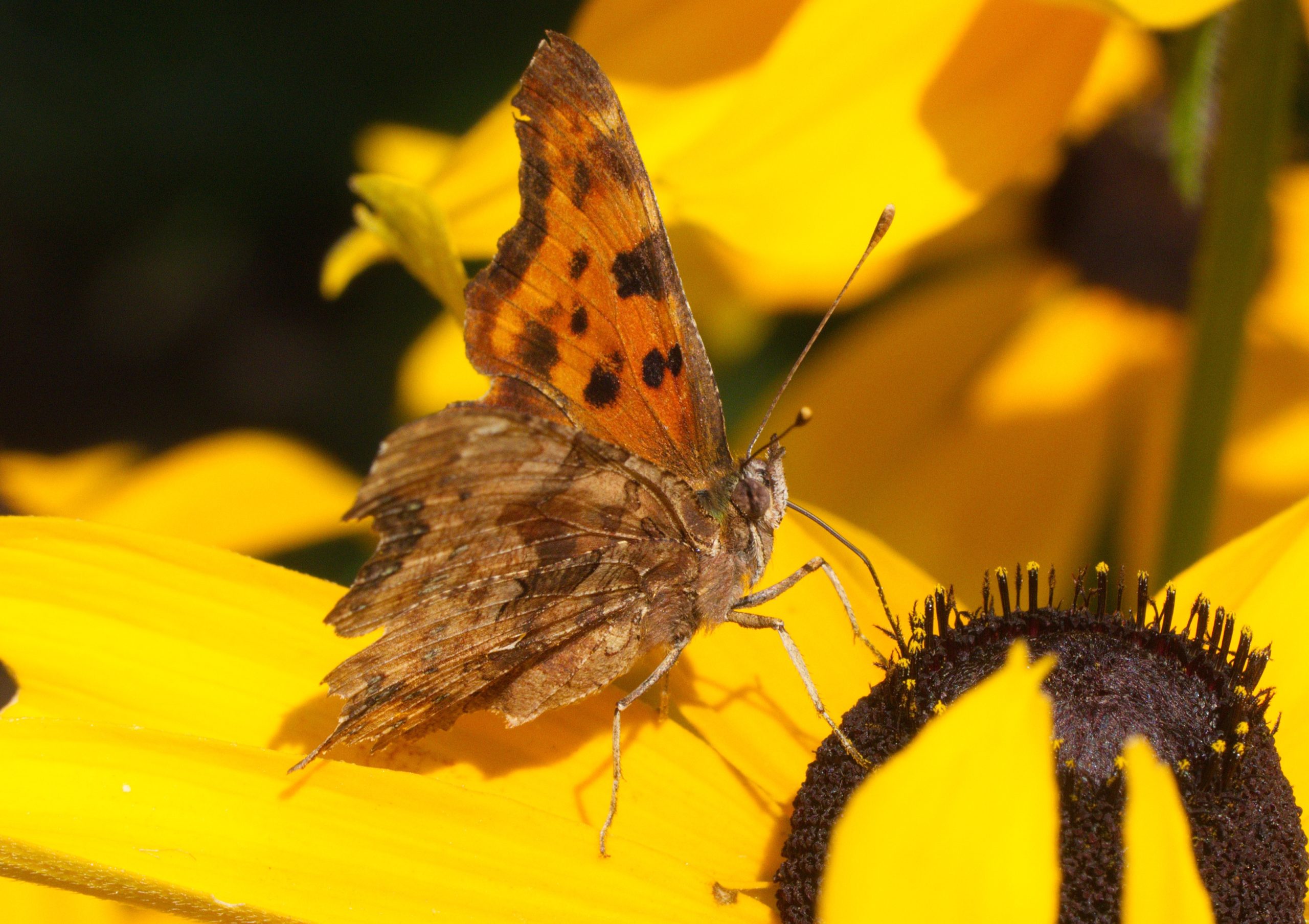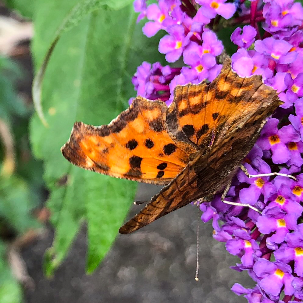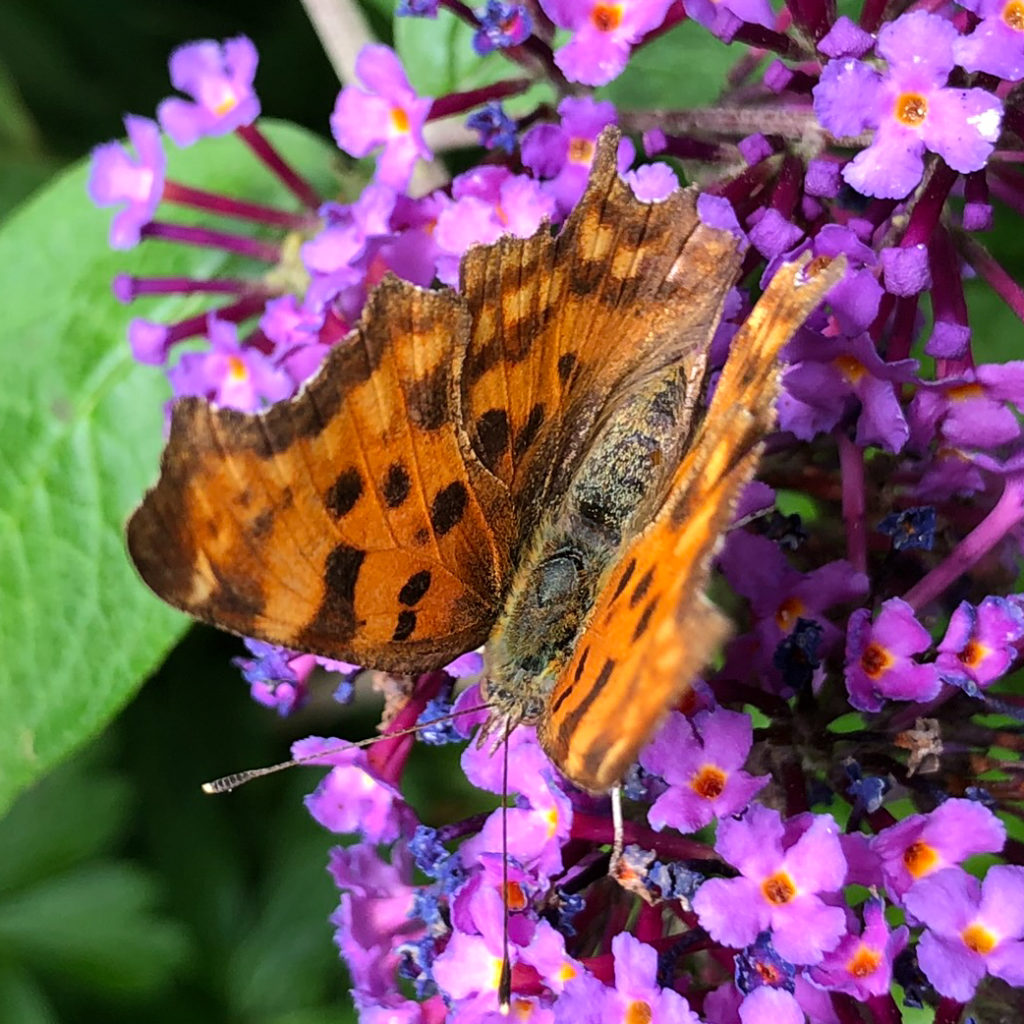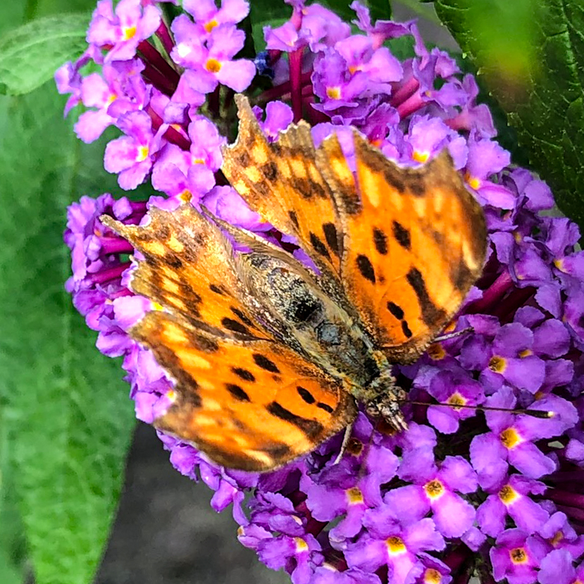 Gelegentlich sehen wir den C-Falter im Garten, dessen Raupen sich unter anderem in Haselnuss- und Johannisbeerbüschen, wie auch an Großen Brennnesseln, wohl fühlen.