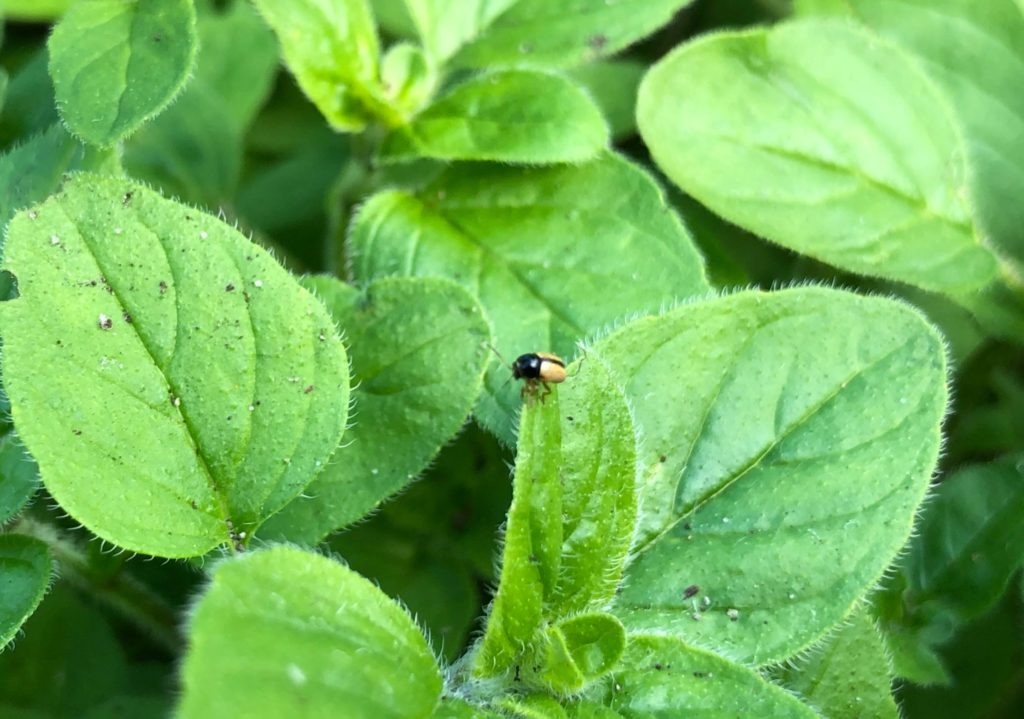 Hier knabbert der kleine Blattkäfer vermutlich am Oregano.